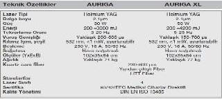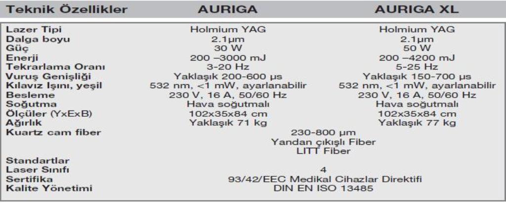AURIGA Laser sistemi uygun fiber ve lazer ayarları ile geniş bir uygulama seçeneği sağlar. Renal ve üreter her tür tafl tedavisi Tümör ve neoplazma vaporizasyonu Üretra darlıklarının tedavisi Darlık insüzyonu ve rezeksiyonu Mesane boynu insüzyonu Ablasyon Kondilom rezeksiyon ve koagülasyonu LITT LCD kontrol panelinden değişik uygulamalar için programlanabilir Uygulama menüsü AURIGA XL Arttırılan teknik değerleri ile ilave tedavi imkanları sunar. Yüksek frekanslı taş kırma ile taşı toz haline getirme. Prostat ablasyonu (HoLAP) Prostat enüklasyonu (HoLEP) Prostat vaporizasyonu (HoVAP) Daha büyük dokuların temizlenmesi Yüksek güç ile kısa tedavi süresi